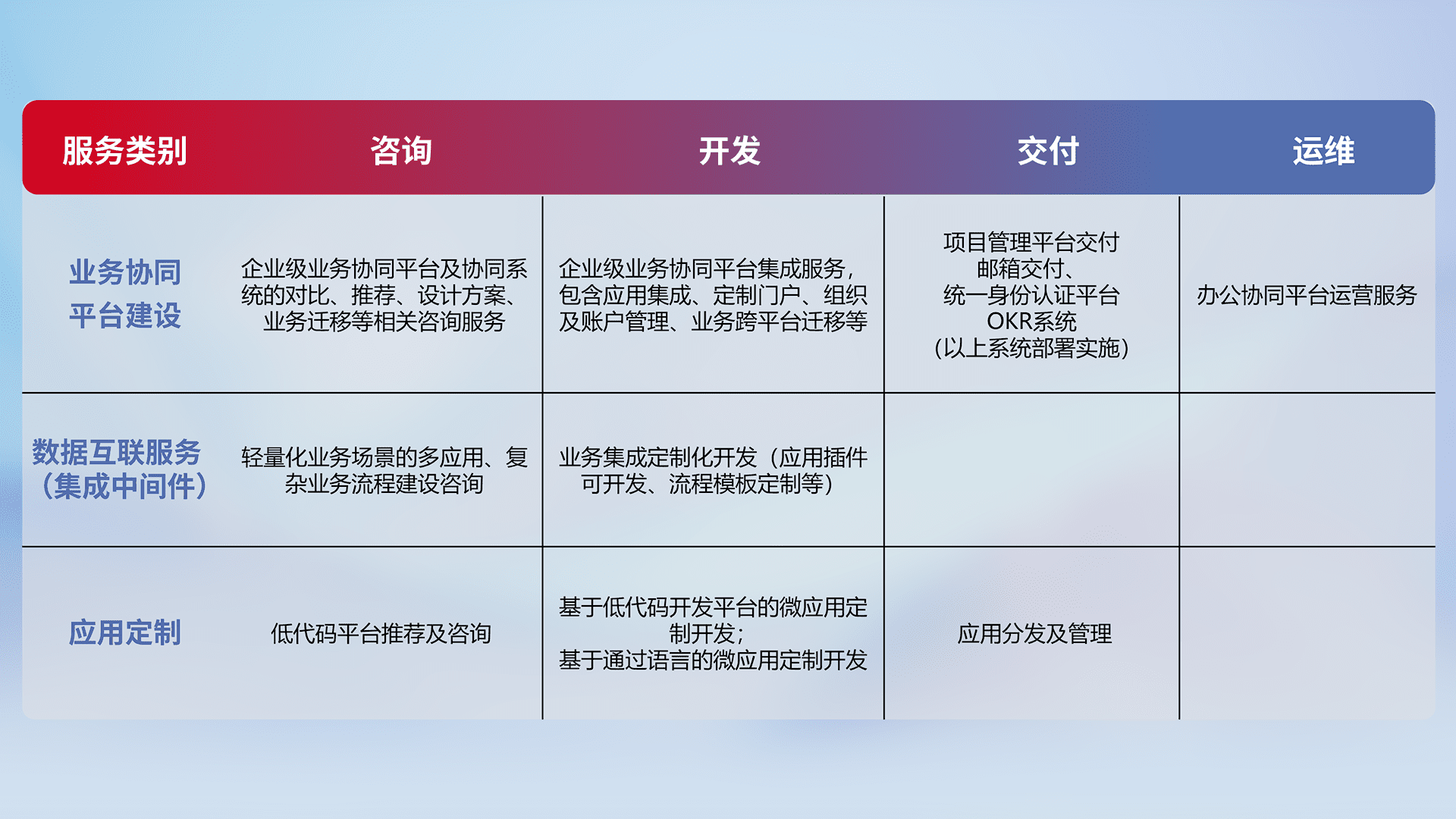 针对钉钉、、企微、、、、IDaas等平台级产品提供产品的规划、、、、方案、、、、交付、、、、定制化开发等服务,,,,实现如统一协同办公、、、智能客户服务、、、、混合会议管理、、、、智能数据查询、、、等业务场景,,实现数字化转型。。